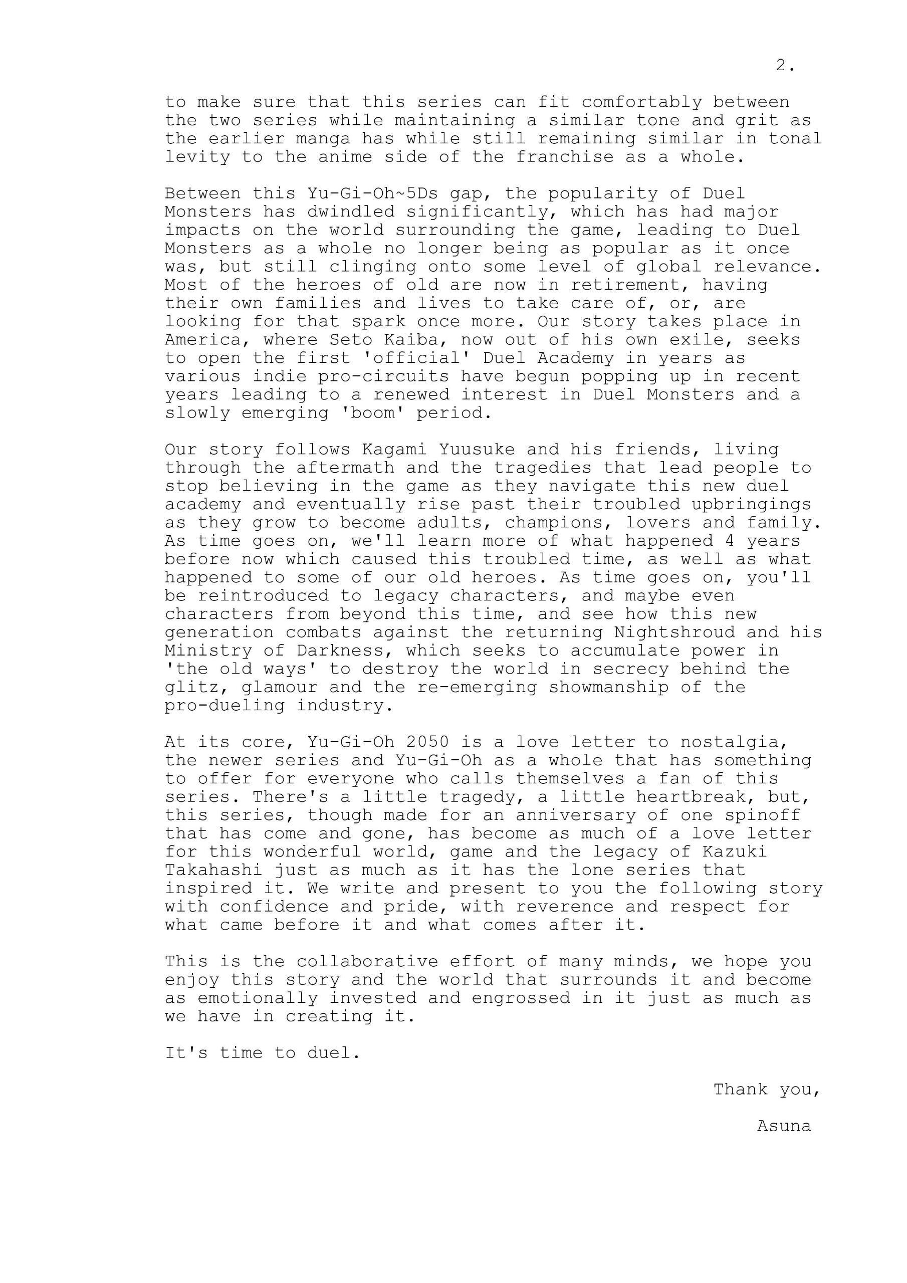 "Revival" (復活) is the first 'episode' of Yu-Gi-Oh 2050. It was first released on October 6th, 2019 alongside Episode 0 on Fanfiction.net in a light novel format, though, has been rewritten in our new (heavily non-standard) screenplay format. It is an homage to the first episode of Yu-Gi-Oh! GX, following its same premise.BRIEF SUMMARY: 15 years after the end of Yu-Gi-Oh! GX (Anime), the game of Duel Monsters has grown to be a household name across the entire face of the planet. Years before now, a corporate merger between Industrial Illusions and Kaiba Corporation resulted in the downfall of the National Duelist Alliance, yet, several indie commissions and outlaw duelling promotions have caused resurged interest in game of Duel Monsters as a profession.Kagami Yuusuke is a candidate to enter the new flagship branch of Seto Kaiba's Duel Academy, the first one owned and operated by the man who started the Duel Academy initiatives in almost 25 years. With that, he must take an entrance exam to qualify, and on his way there, he encounters Jaden Yuki, closely mirroring a scene played out several decades prior.